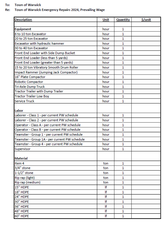 bids at the Town Hall, 132 Kings Highway, Warwick, NY for the following: Proposals for unit prices to perform emergency repairs as a result of storm conditions for the Town of Warwick.